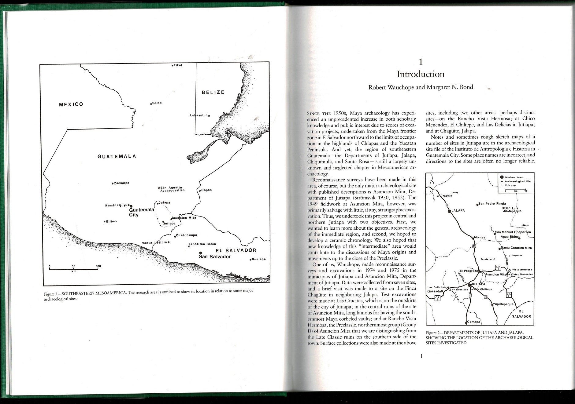 In 1974 and 1975 Robert Wauchope carried out two seasons of archaeological reconnaissance and excavations, in the northern half of the department of Jutiapa, centering his work mainly in the environs of Asuncion Mita and the cabecera of Jutiapa. He returned to Guatemala in 1976 to continue the analysis of the ceramics, but illness made it impossible to complete the work before his death in 1979. He left copious notes and a partial manuscript that includes the site excavation descriptions and some sections of the introduction of this report. E W Andrews V asked Margaret Bond to complete the work.