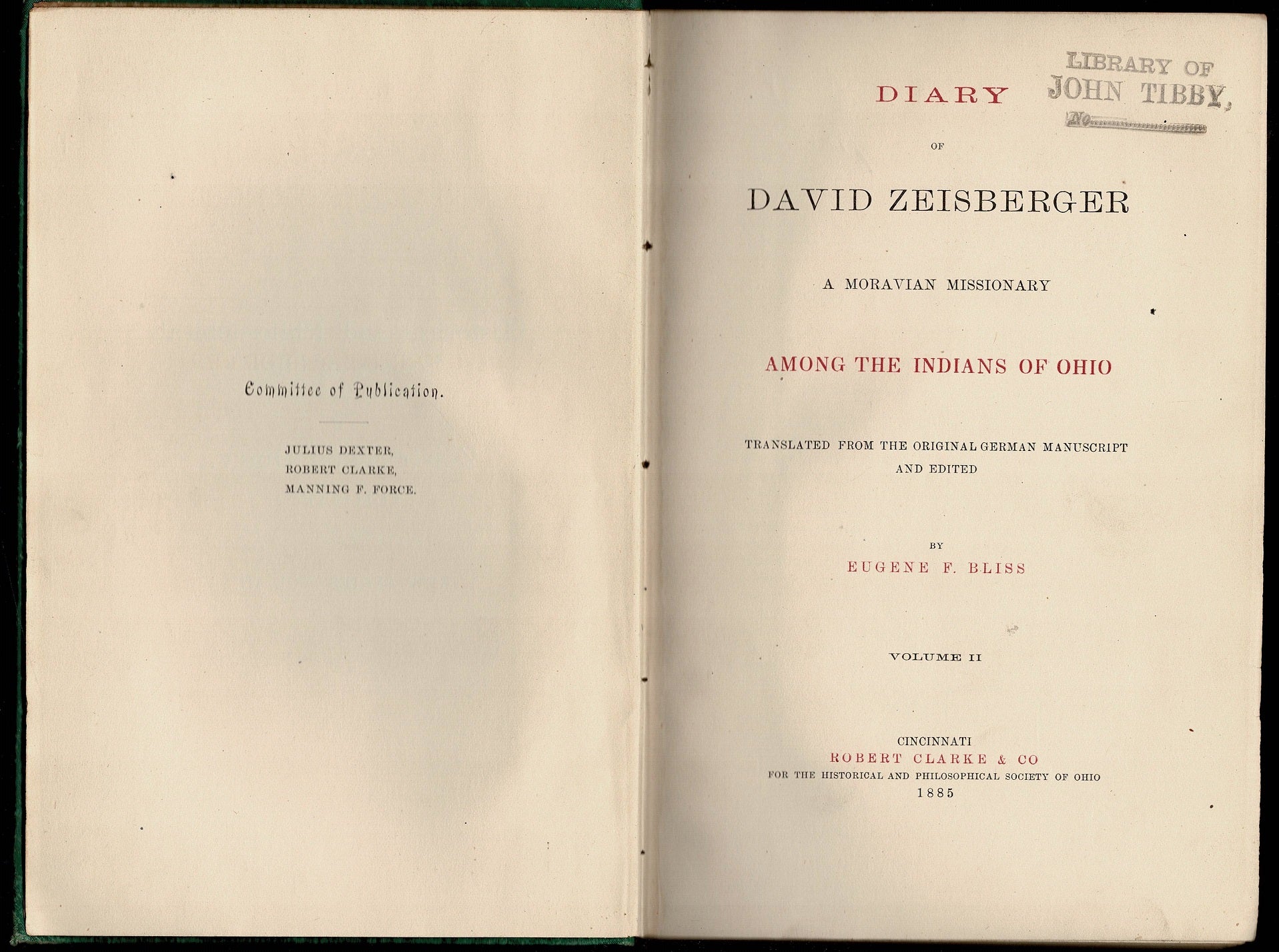 2 volumes [xxii]+464 pages; [iv]+535 pages with index. Royal octavo (9 1/2" x 6 3/4") bound in original publisher's green cloth with gilt lettering to spine and double blind-stamped ruled edge to cover, head page ends in gilt. Published by Robert Clarke & Co for the Historical and Philosophical Society of Ohio. Translated from the original German manuscript and edited by Eugene F Bliss. Bound in green cloth with gilt lettering to spine, gilt head end pages. [Howes Z5] First edition.