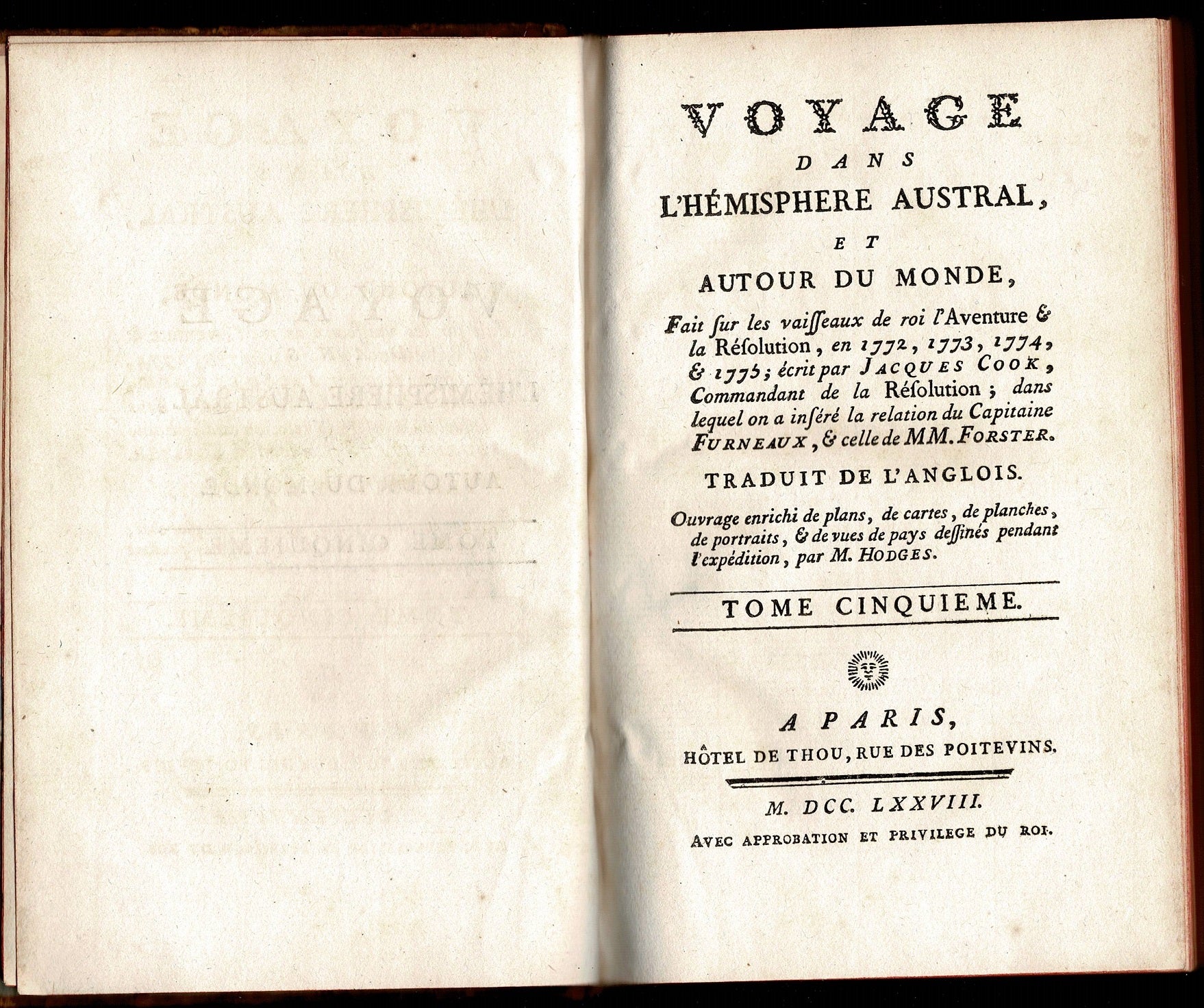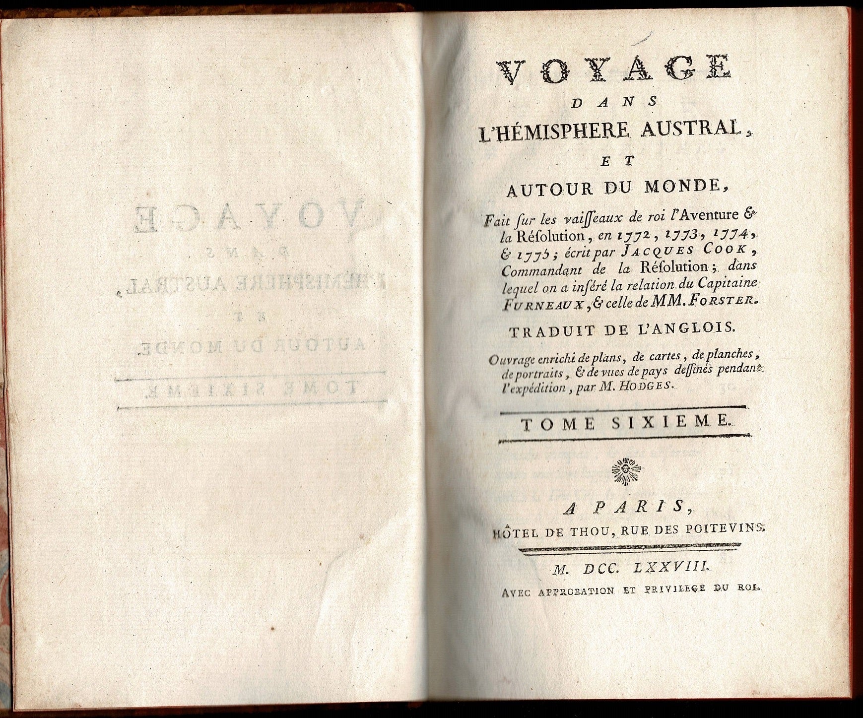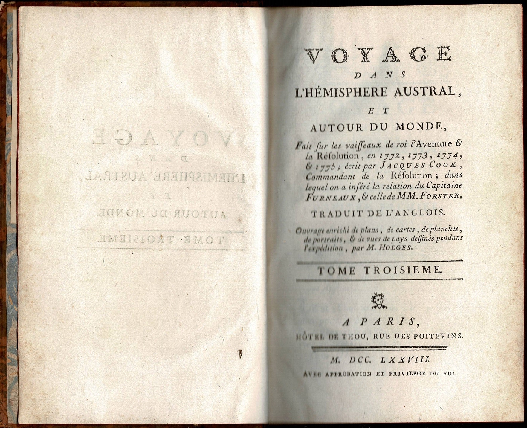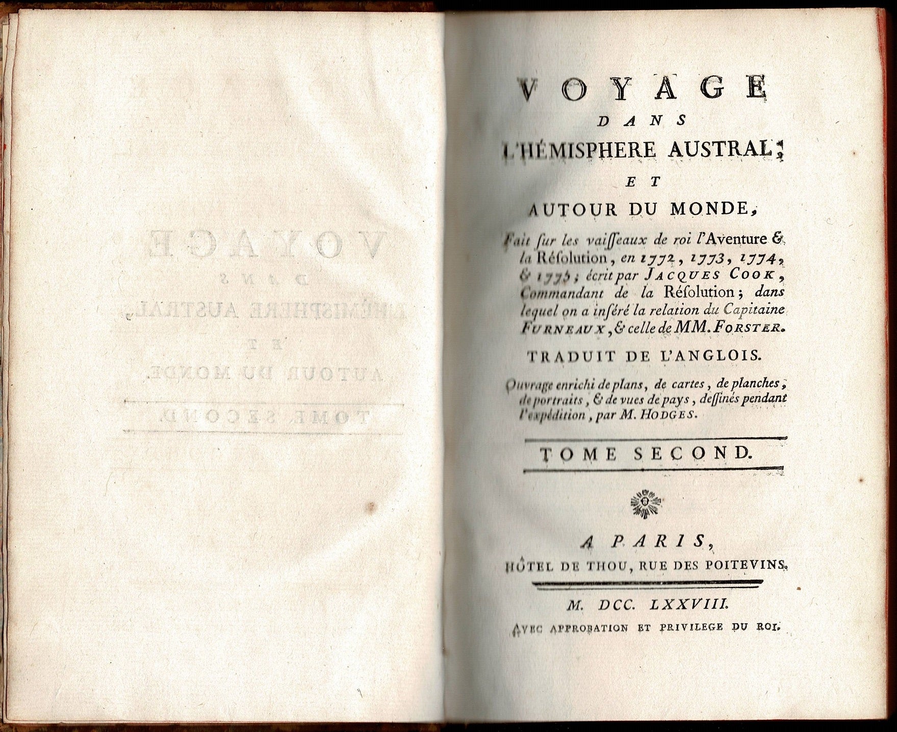 Two French editions, both translated by Suard, appeared in 1778: one in five text volumes together with an atlas volume with 65 plates; and the present work, in six text volumes with an atlas volume containing 66 plates. The importance of the present work lies in the fact that Suard adds passages by Forster not included in his earlier work.