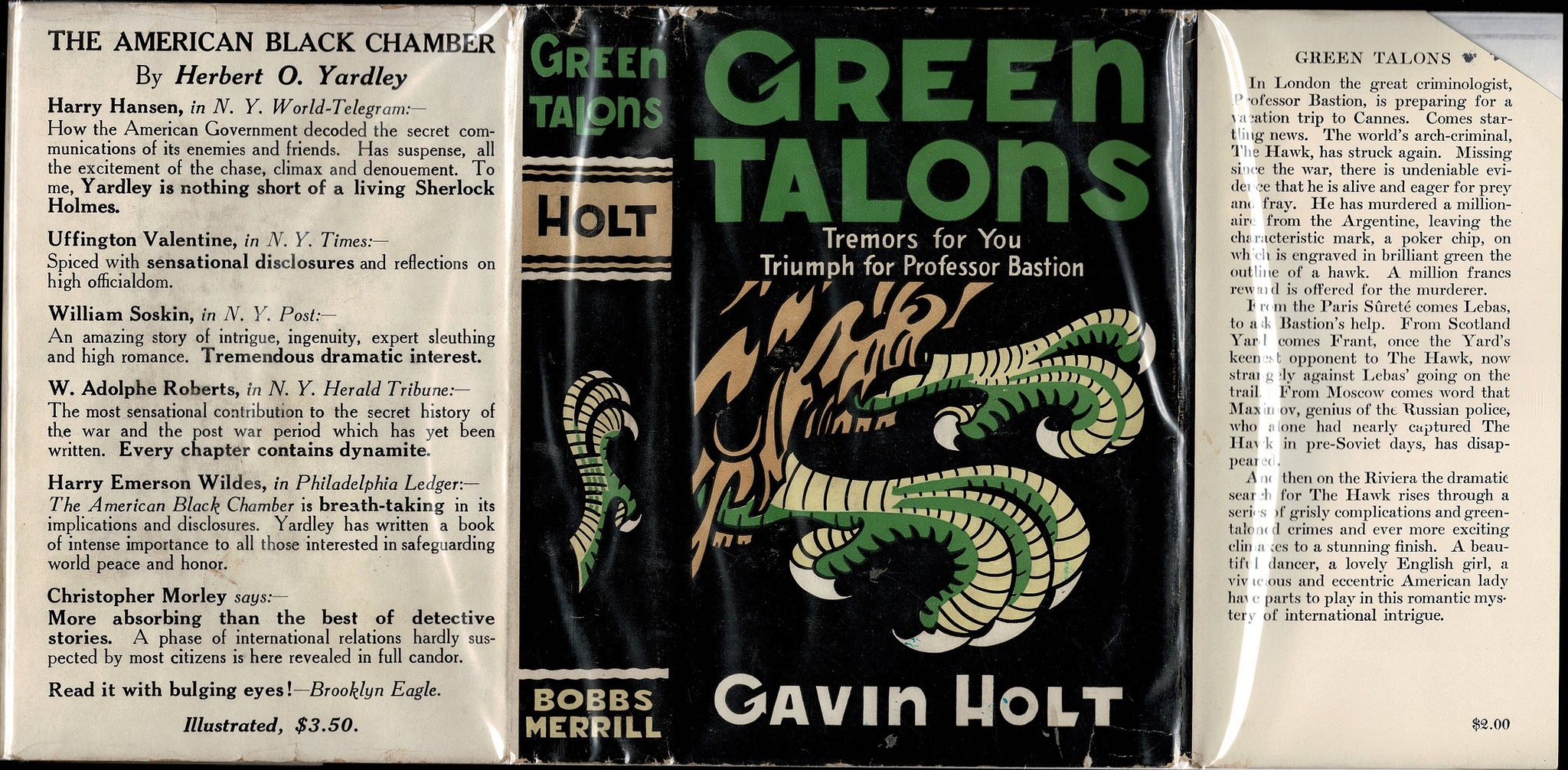 In London the great criminologist Professor Bastion is preparing for a trip to Cannes. Comes startling news. The world's arch-criminal, The Hawk, has struck again. Missing since the war, there is undeniable evidence that he is alive and eager for prey and fray. He has murdered a millionaire from the Argentine, leaving the characteristic mark, a poker chip, on which is engraved in brilliant green the outline of a hawk.