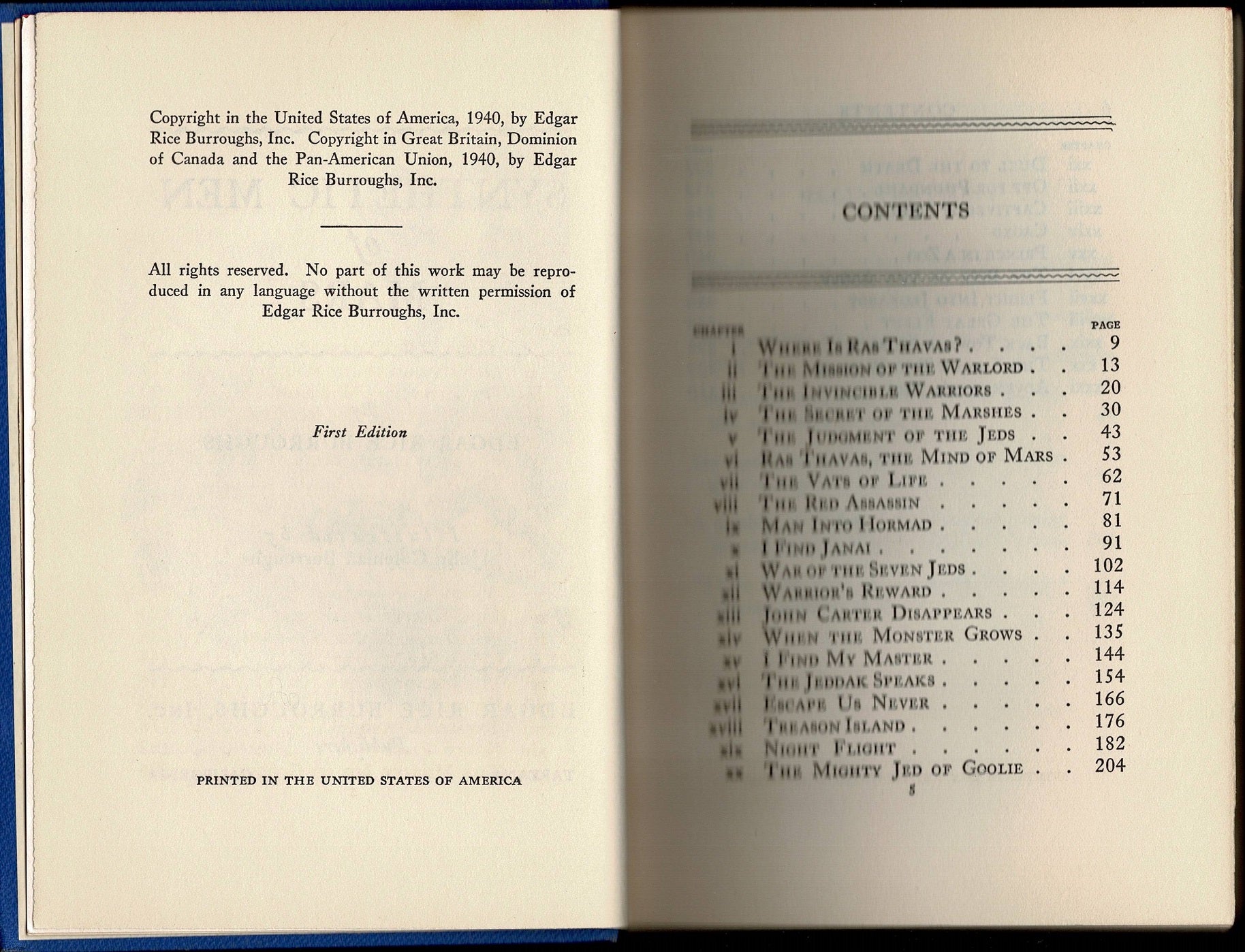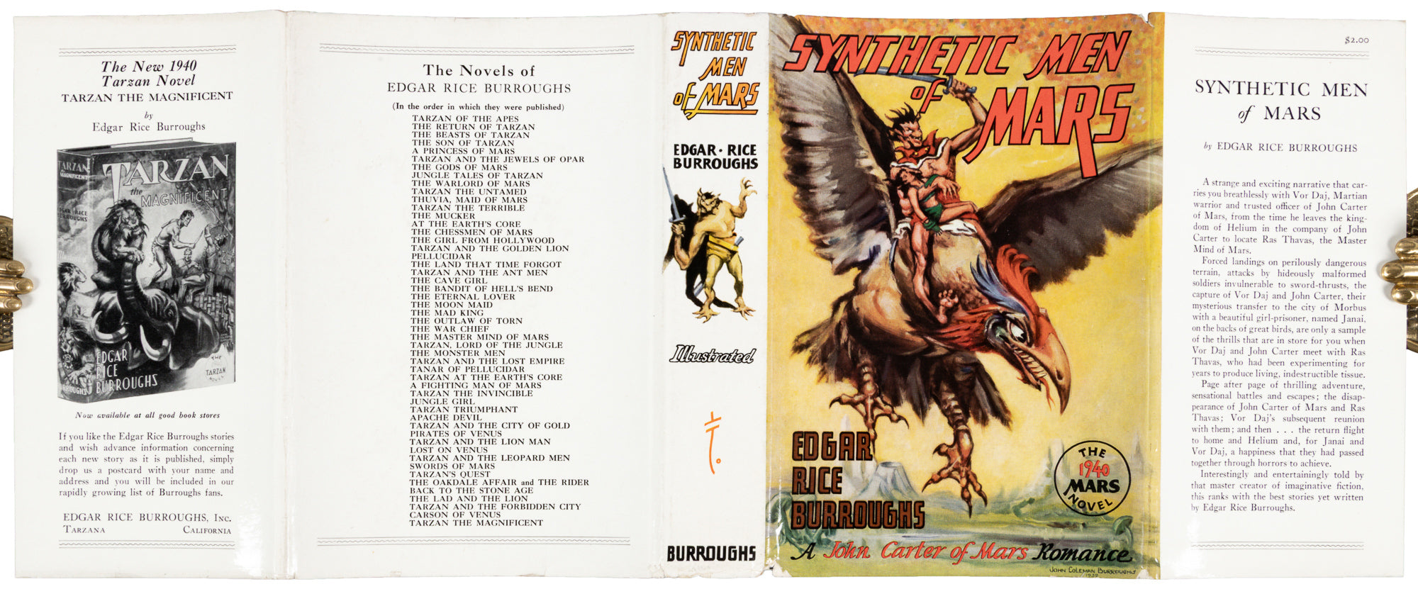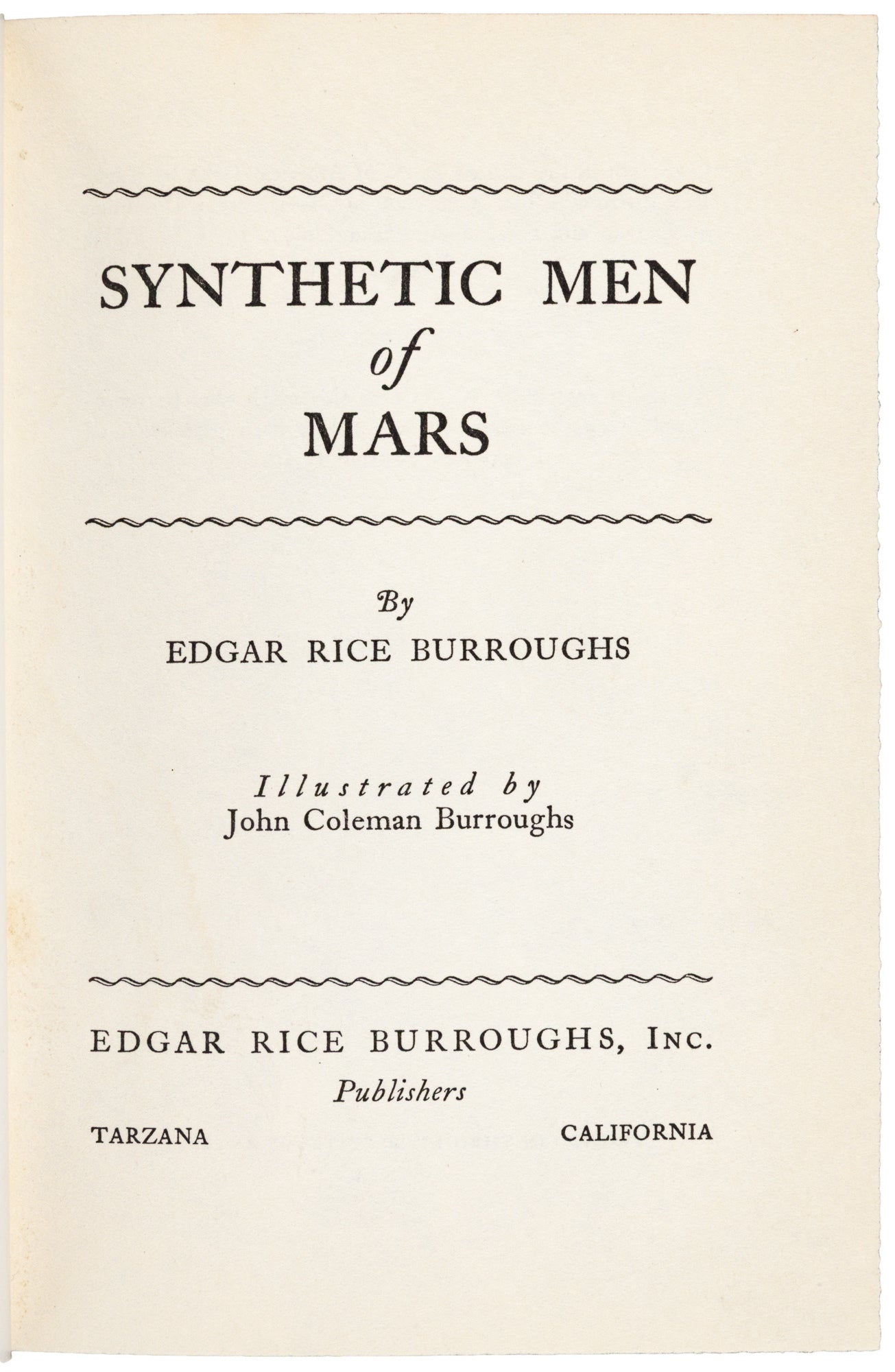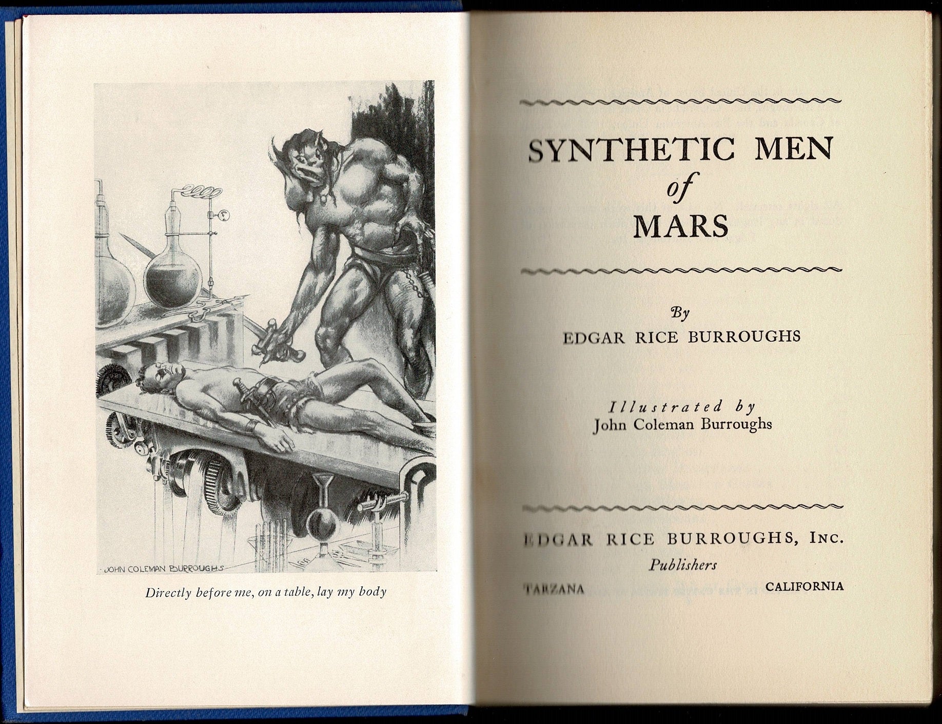 Synthetic Men of Mars is a science fantasy novel by American writer Edgar Rice Burroughs, the ninth of his Barsoom series. It was first published in the magazine Argosy Weekly in six parts in early 1939. The first complete edition of the novel was published in 1940 by Edgar Rice Burroughs, Inc. Despite a successful career stretching back more than two decades, Burroughs had trouble finding a publisher for the serialized version of the novel. Both Liberty and Blue Book turned him down; Argosy was his third choice. He received US$1200 for the magazine rights.
