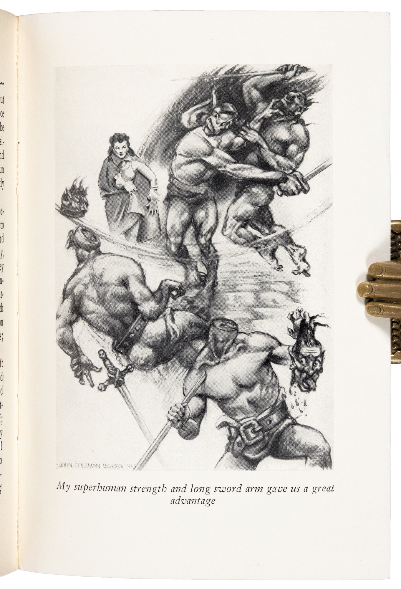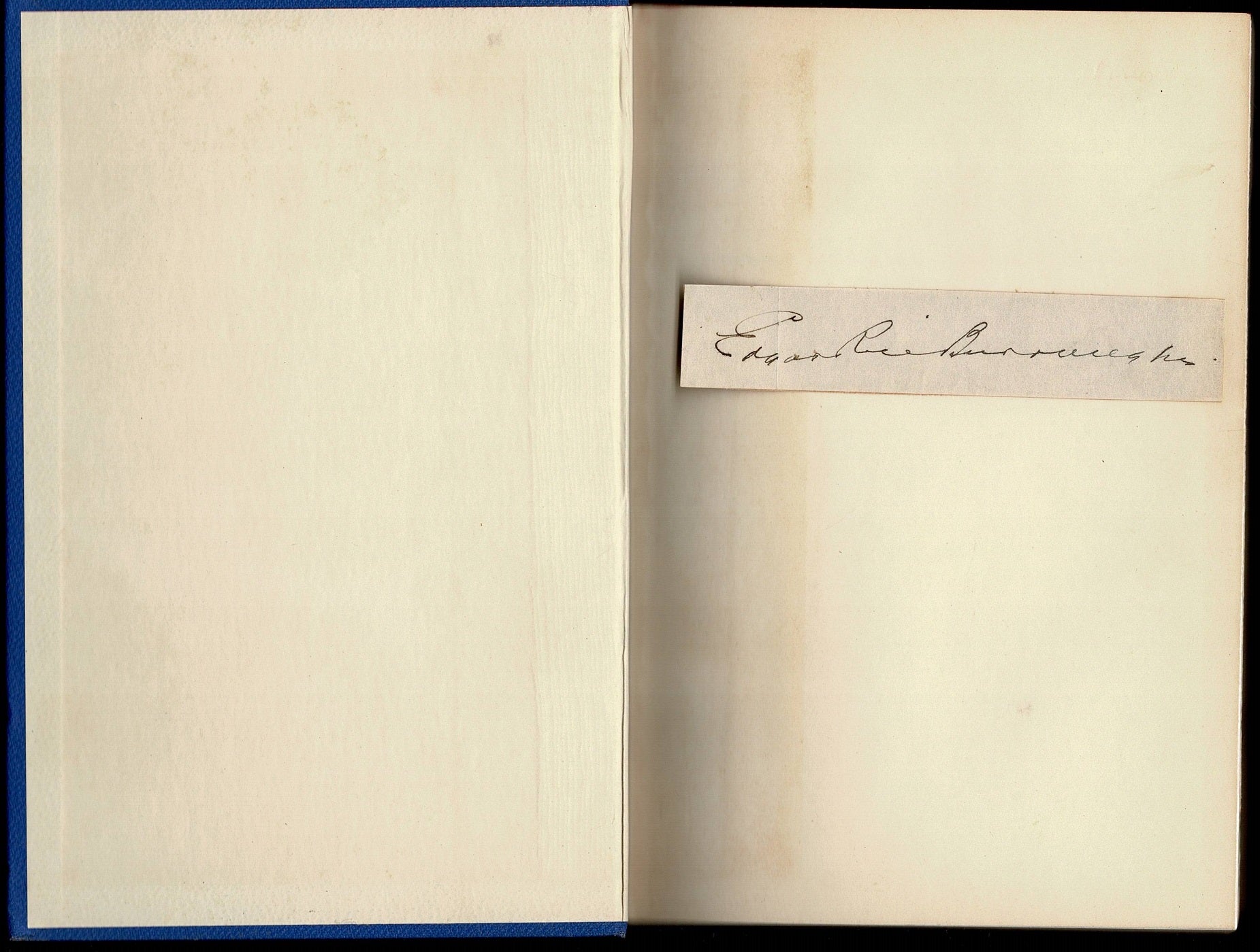 315 pages with frontispiece and Illustrations by John Coleman Burroughs. Small octavo (7 3/4" x 5"), bound in original publisher's blue cloth lettered in orange, color pictorial jacket. Clipped signature of Edgar Rice Burroughs laid down on the front free endpaper. (Heins M9.1; Zeuschner 511; Reginald 02325) First Edition.